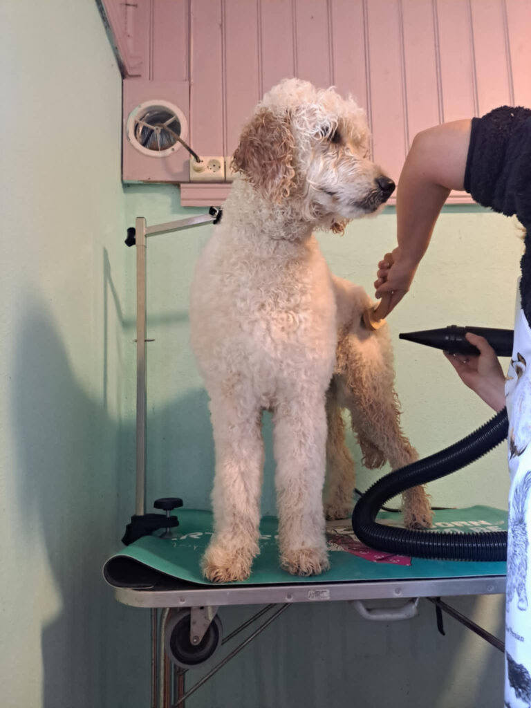Vi benytter varmluft med korrekt temperatur og teknikk, som sikrer at pelsen tørker raskt, trygt og skånsomt.